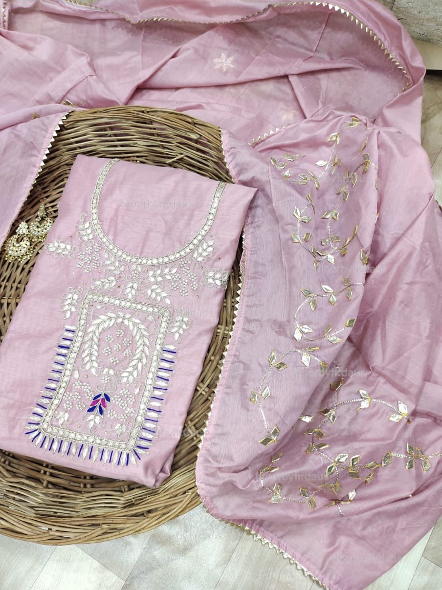 Woven with cotton and silk yarns, Chanderi suits are often embellished with traditional motifs like peacocks, florals, or geometric designs — either in resham thread or metallic zari. These suits are perfect for pujas, family gatherings, or day events where you want to embody quiet sophistication. They’re not just outfits, they’re wearable heirlooms.