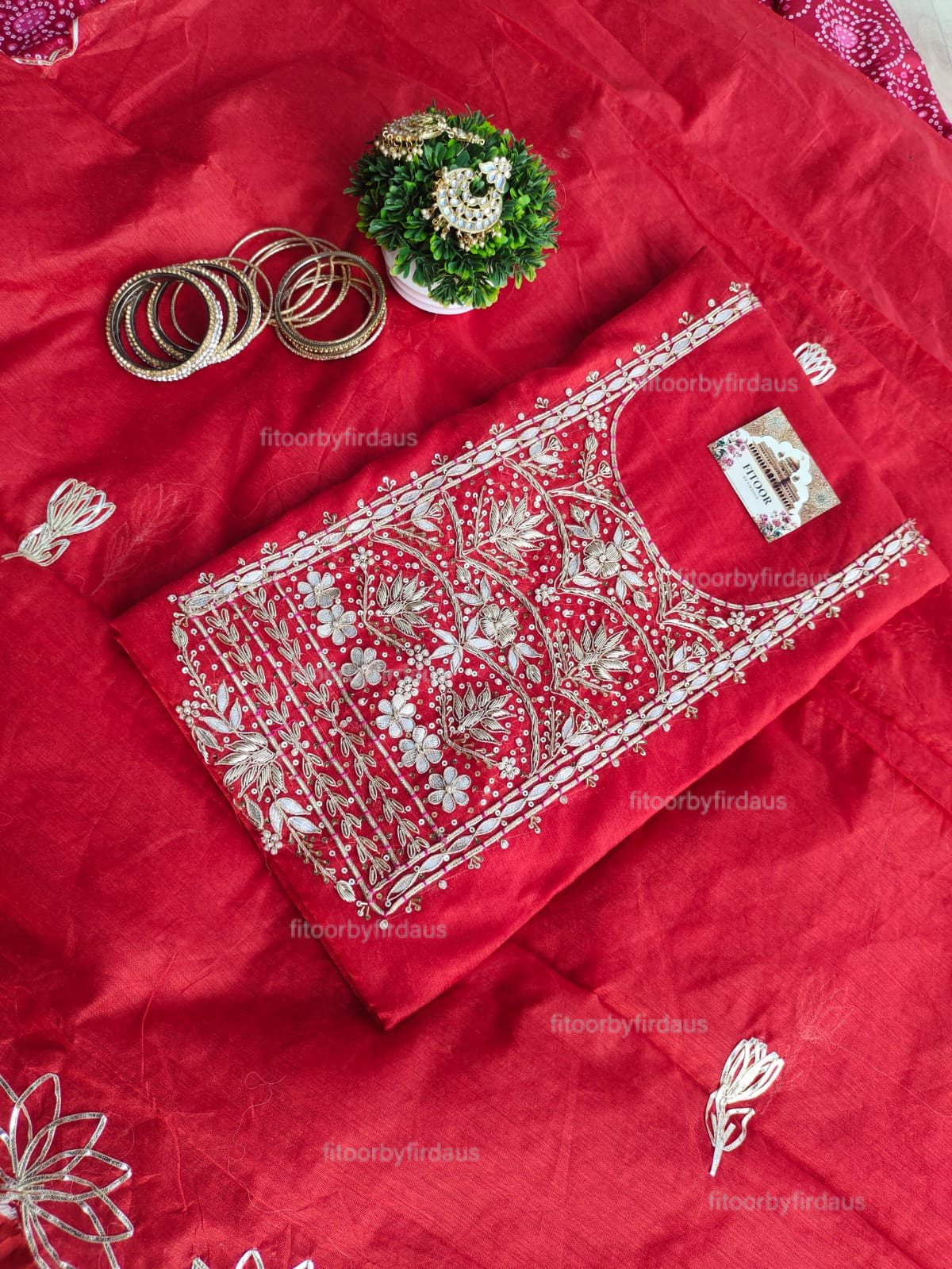 Woven with cotton and silk yarns, Chanderi suits are often embellished with traditional motifs like peacocks, florals, or geometric designs — either in resham thread or metallic zari. These suits are perfect for pujas, family gatherings, or day events where you want to embody quiet sophistication. They’re not just outfits, they’re wearable heirlooms.