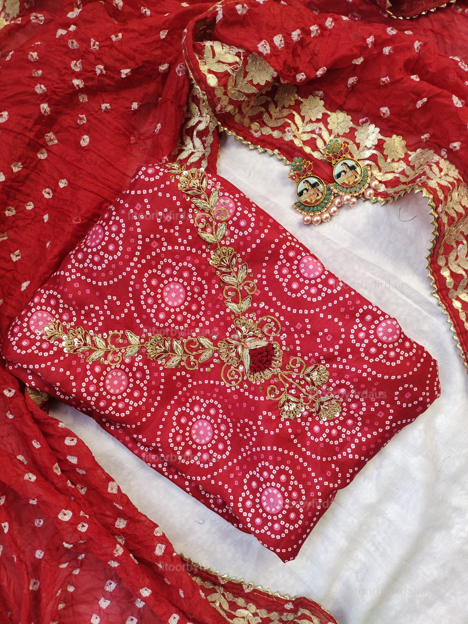 • Every creation is meticulously crafted using traditional techniques such as Zardozi, Bandhani, Leheriya, Gota Patti, Mirror Work, and intricate embroidery. These artisanal touches ensure that no two pieces are ever identical, making each one a unique work of art.
