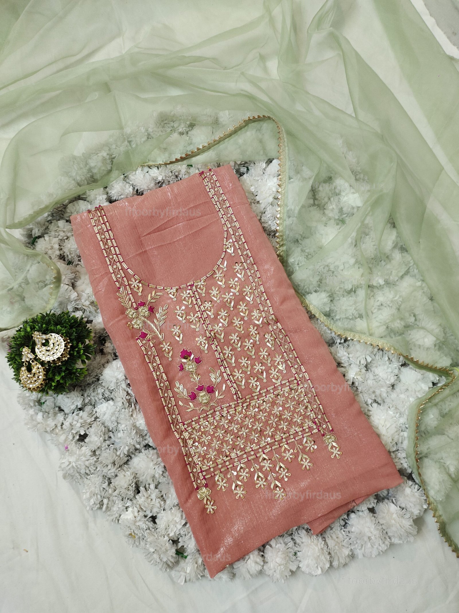 Crushed Tissue suit set with Zardozi handwork and organza dupatta