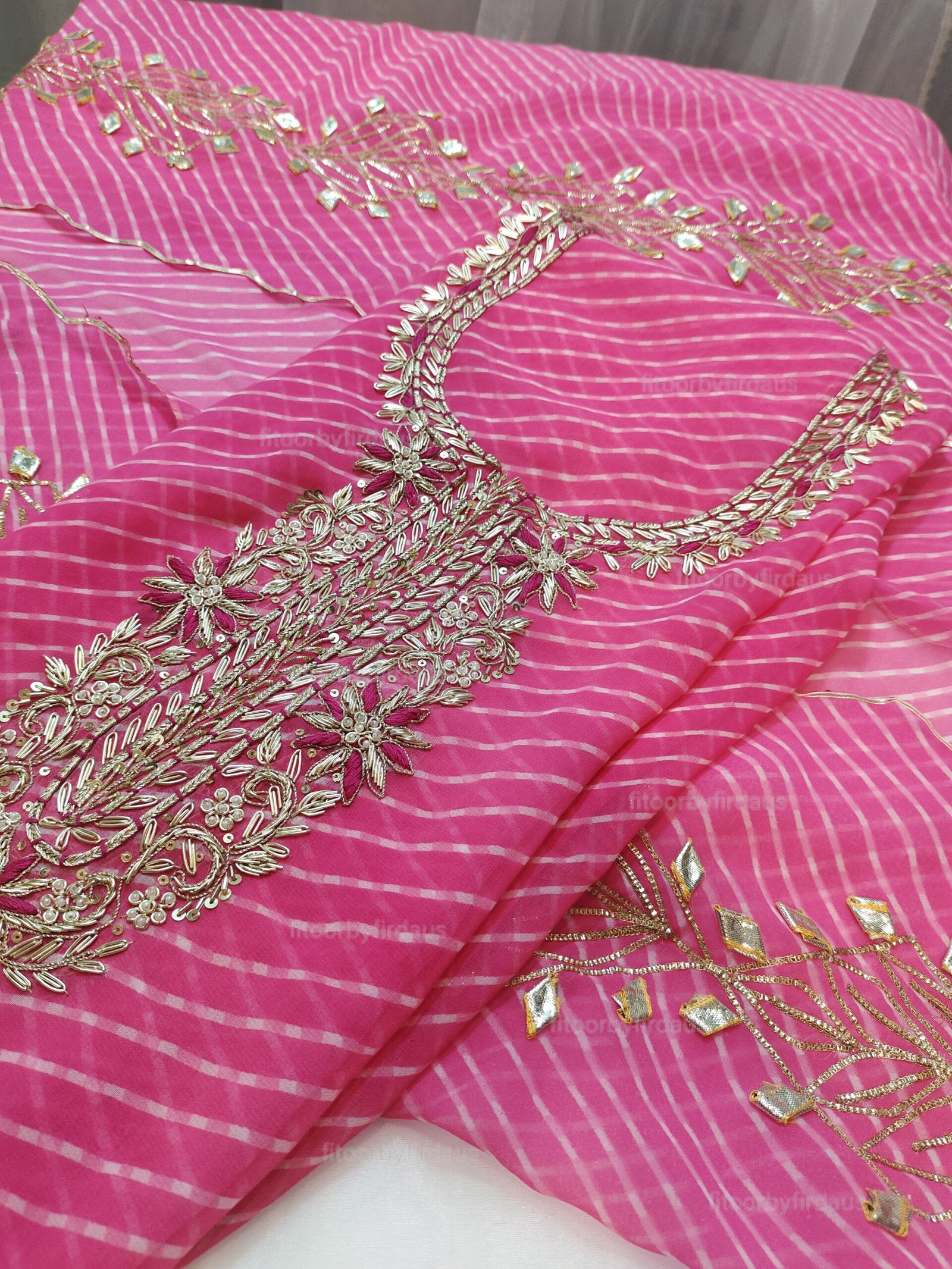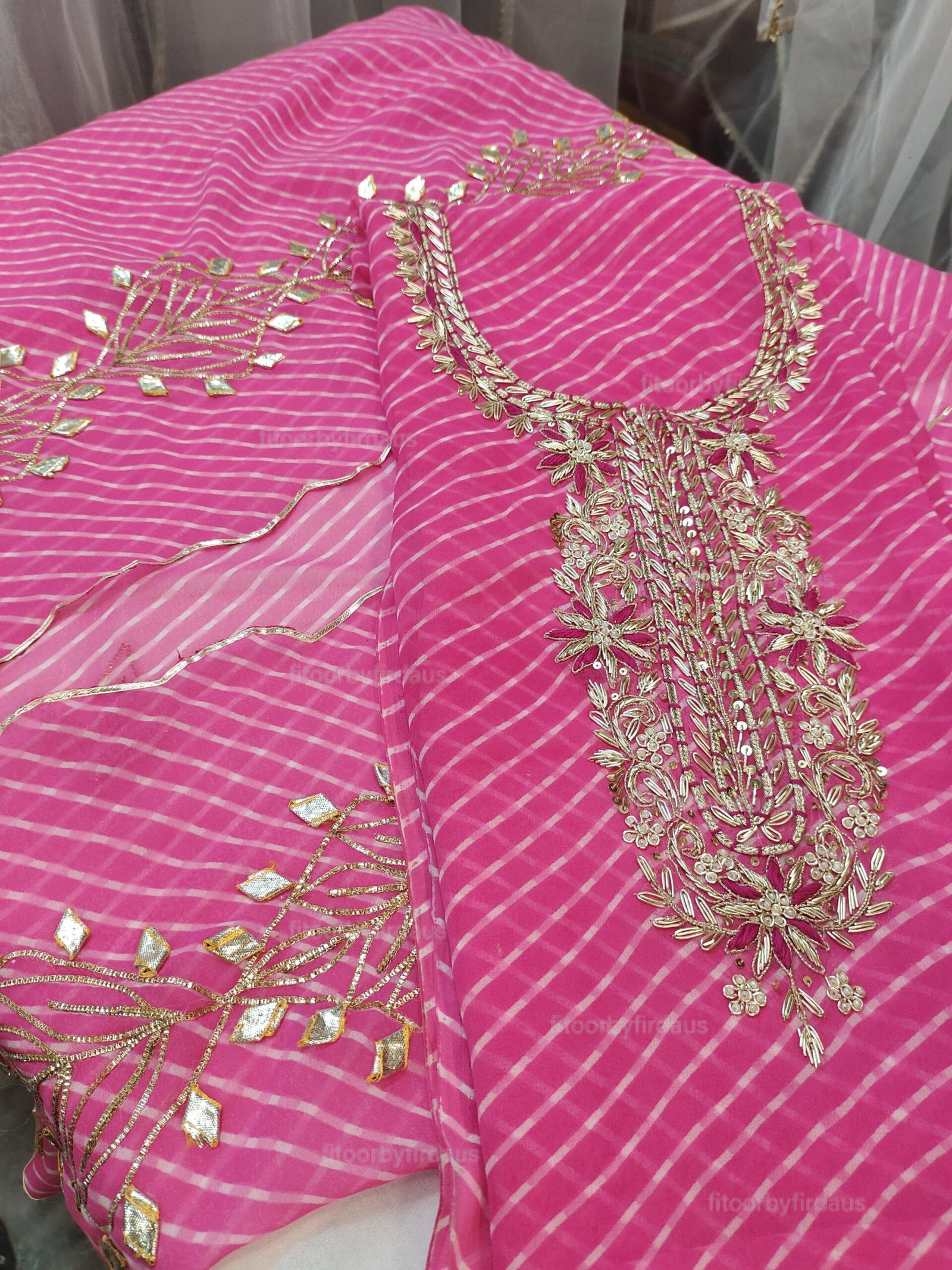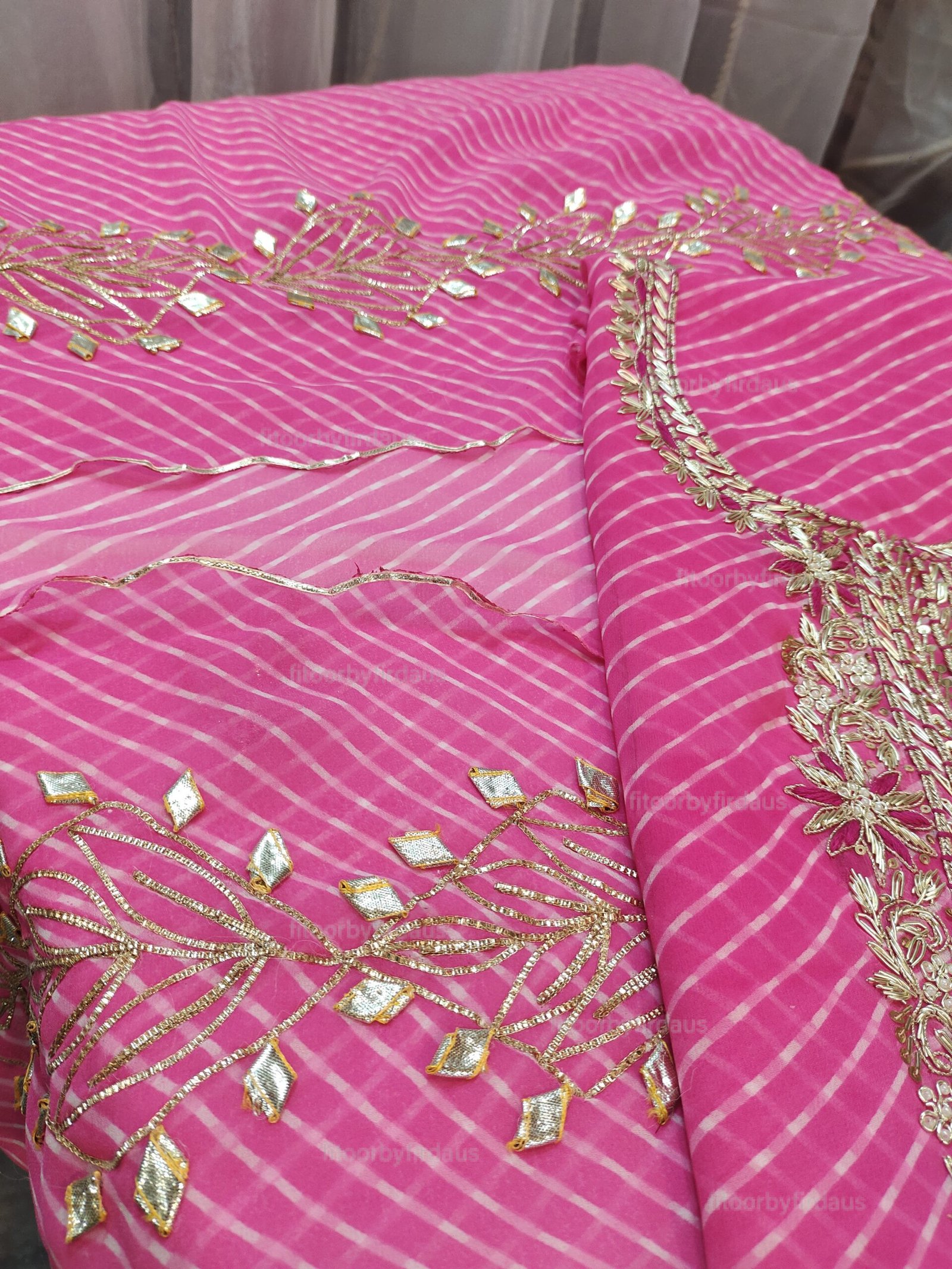 • Every creation is meticulously crafted using traditional techniques such as Zardozi, Bandhani, Leheriya, Gota Patti, Mirror Work, and intricate embroidery. These artisanal touches ensure that no two pieces are ever identical, making each one a unique work of art.
