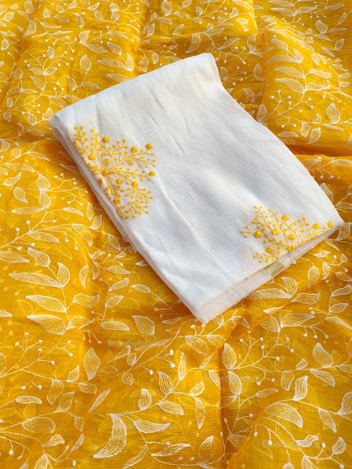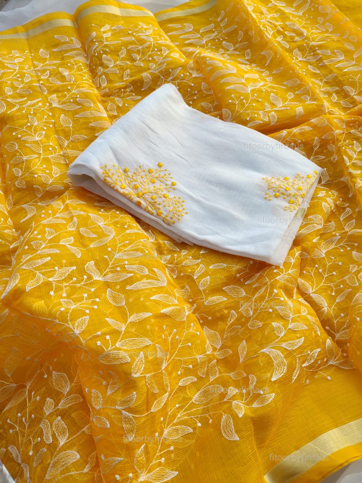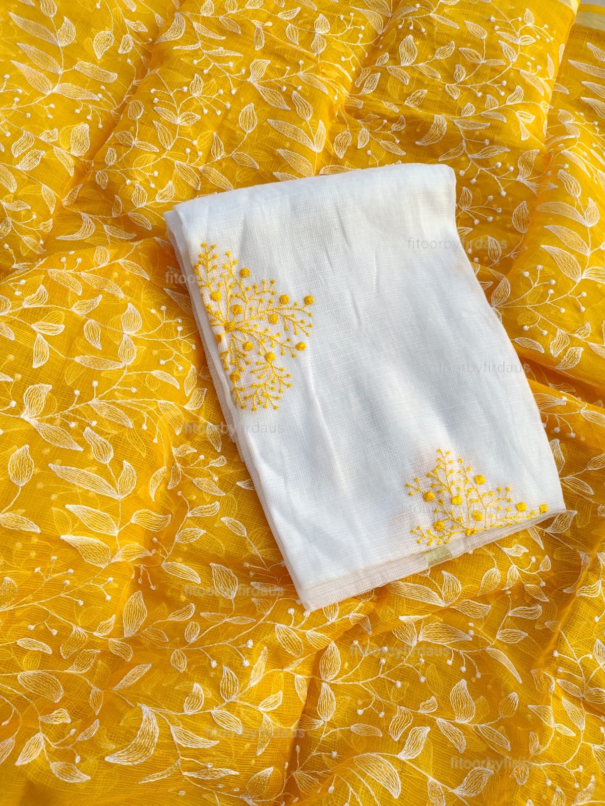 Light as a breeze and beautifully detailed, this Kota Doria suit features intricate machine embroidery on a sheer, breathable fabric. Perfect for effortless elegance in every season.