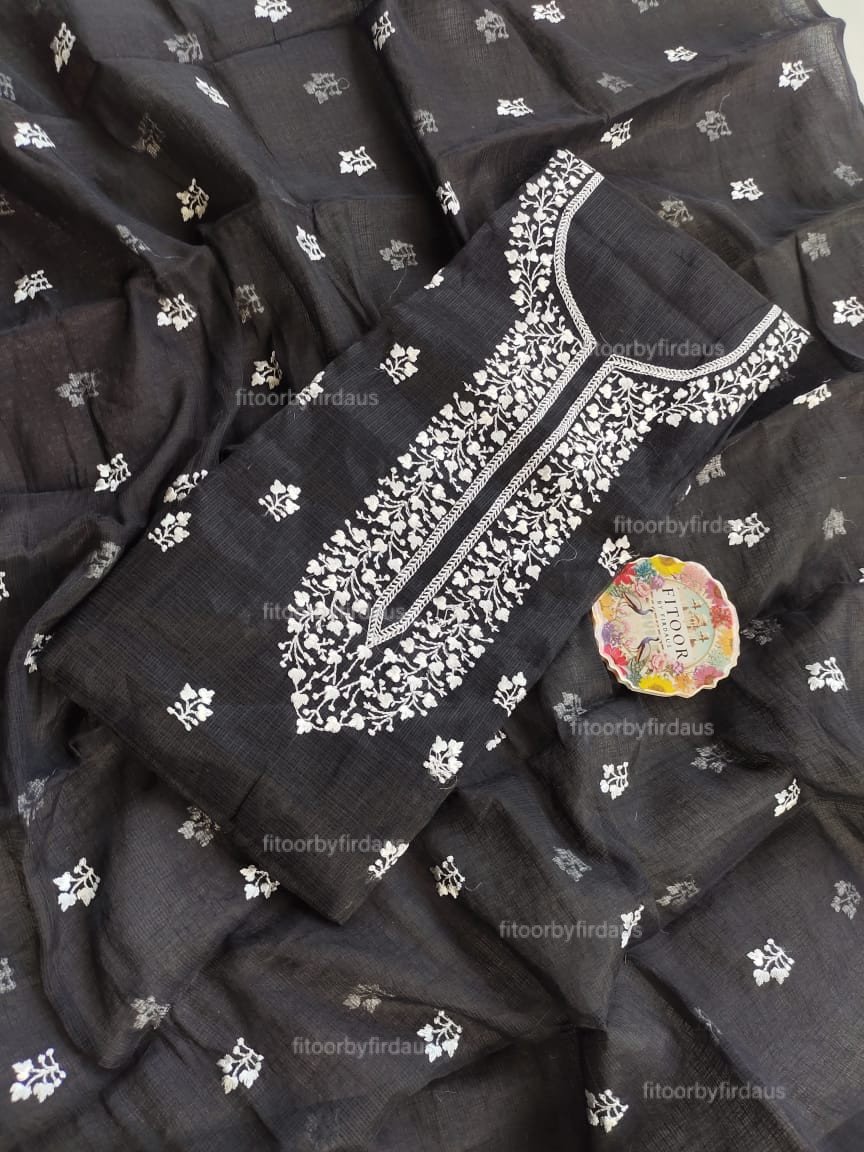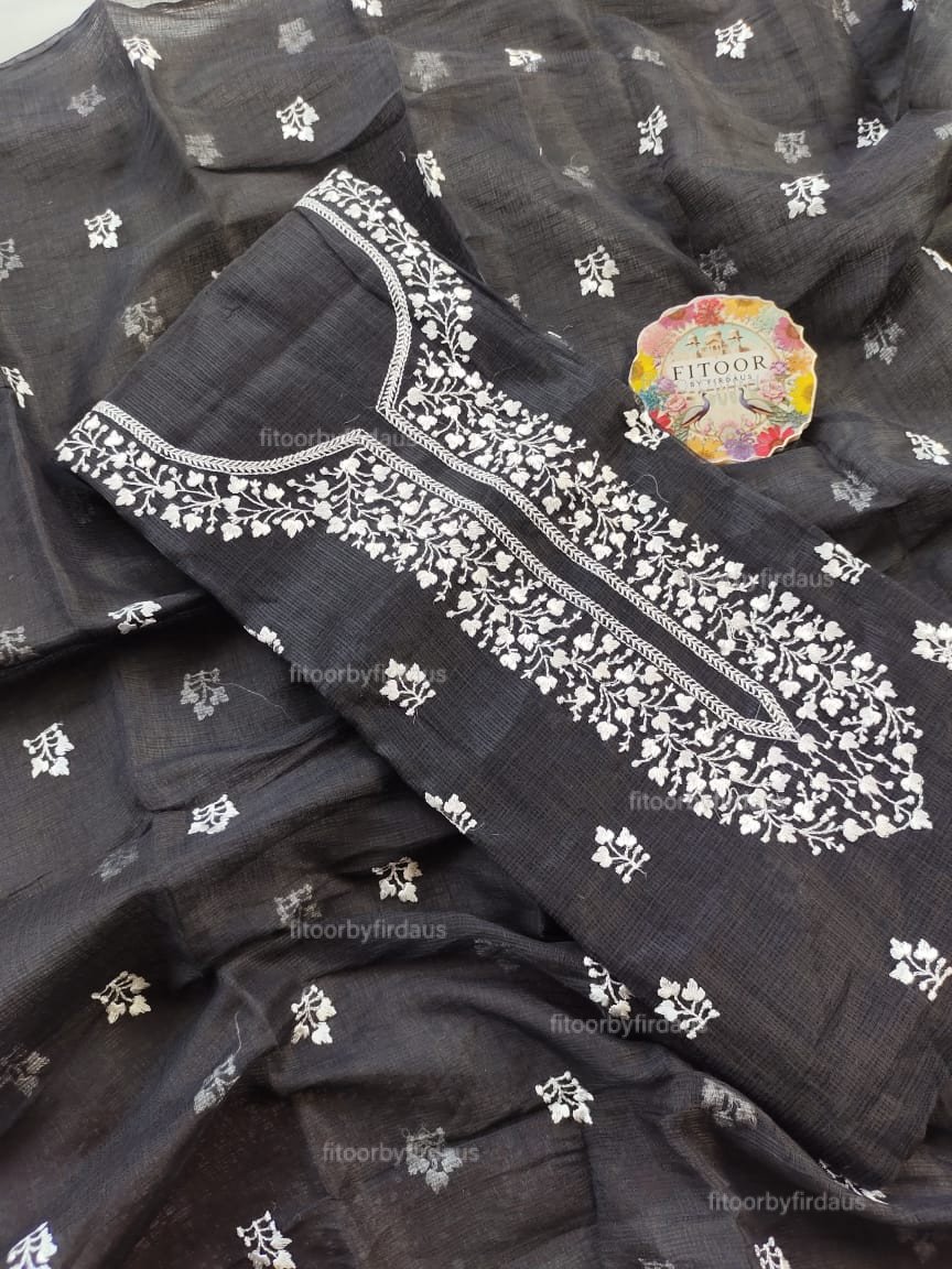 Light as a breeze and beautifully detailed, this Kota Doria suit features intricate machine embroidery on a sheer, breathable fabric. Perfect for effortless elegance in every season.