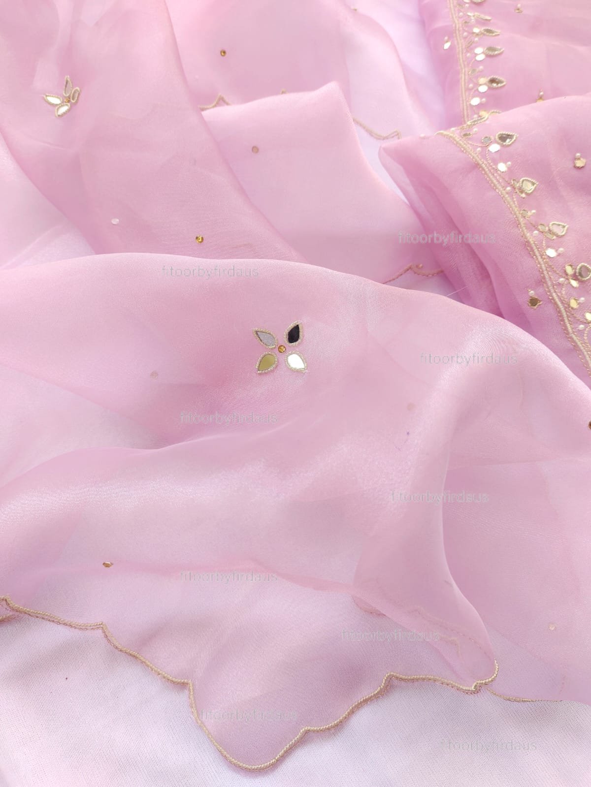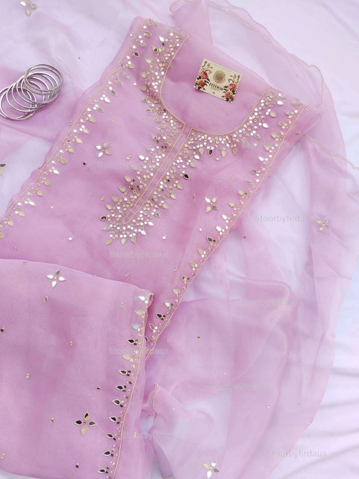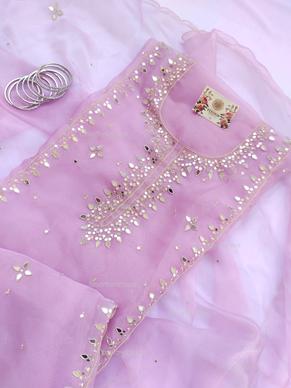 Organza suit set with mirror and beaded hand work and hand work dupatta