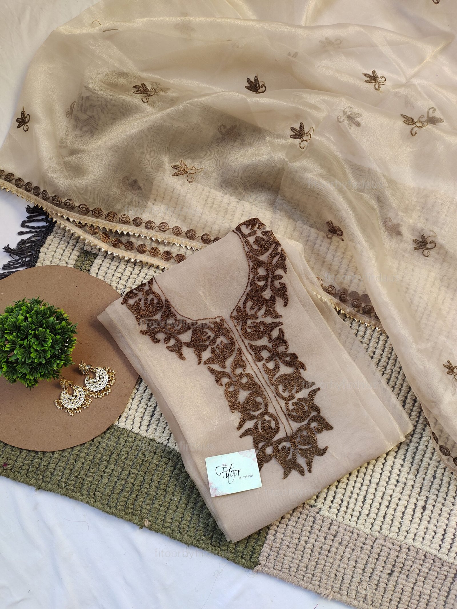 Brown Organza suit set with thread work