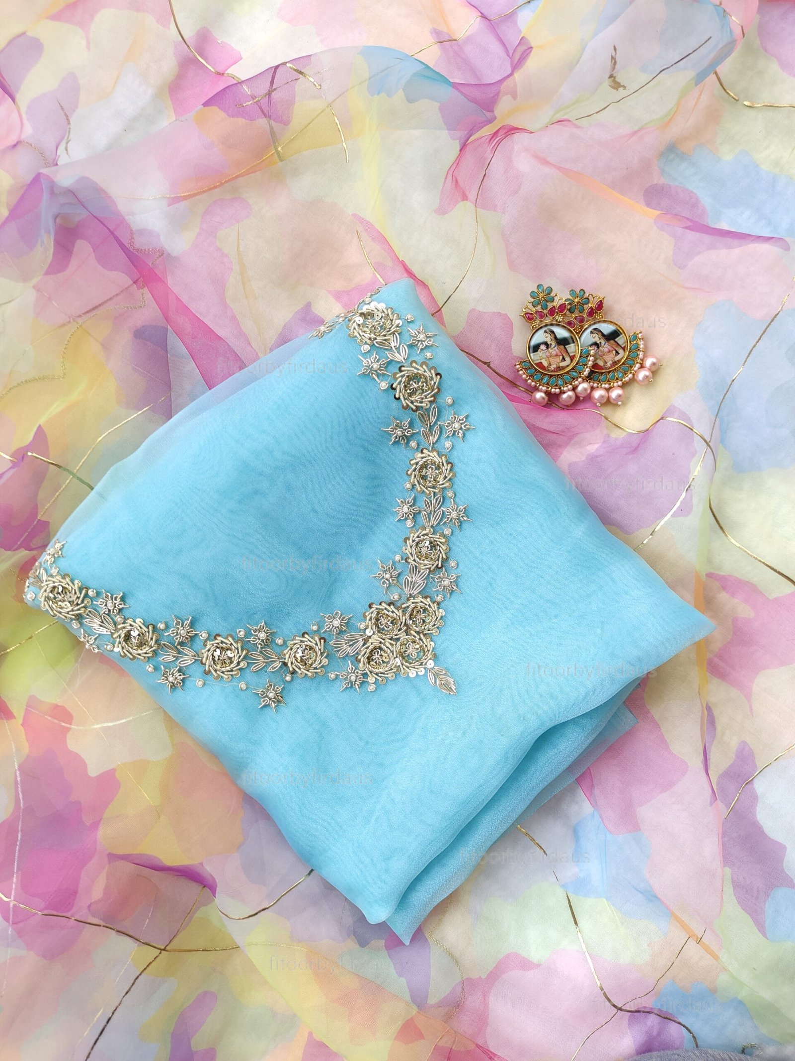 Organza suit set with zardozi work and multi color dupatta