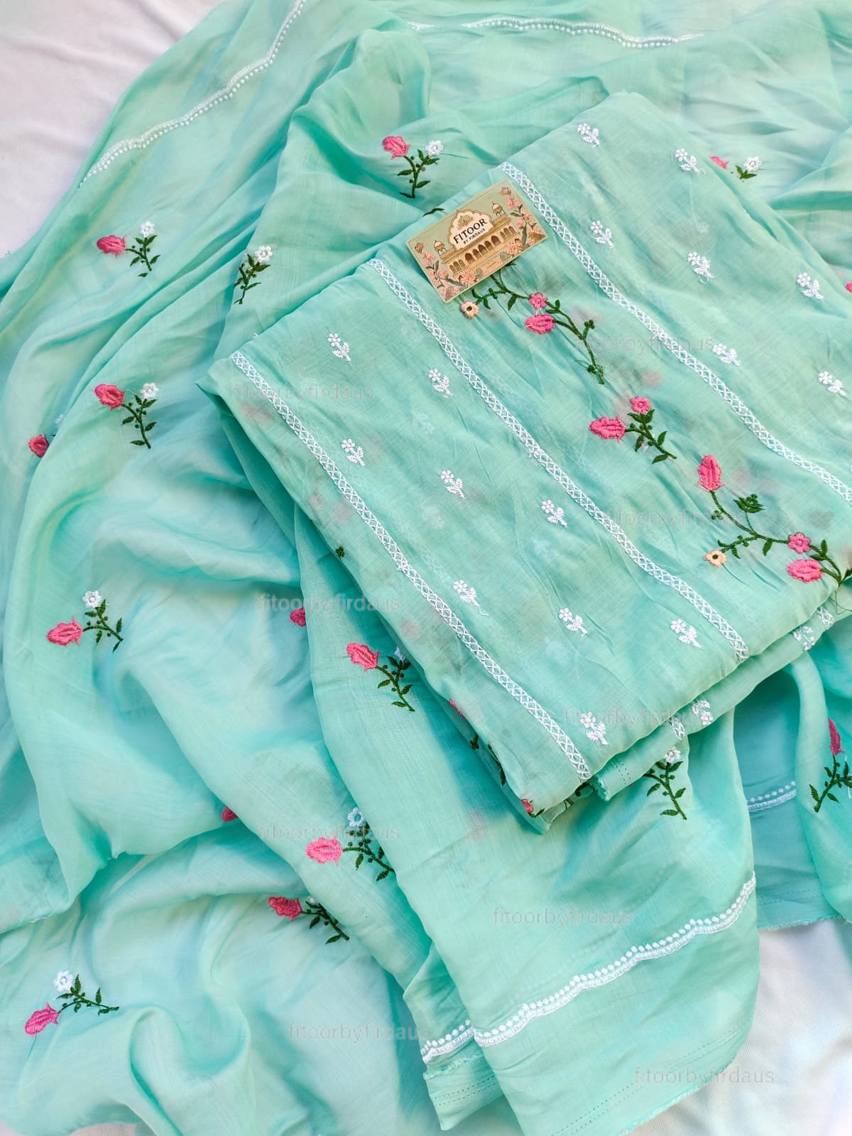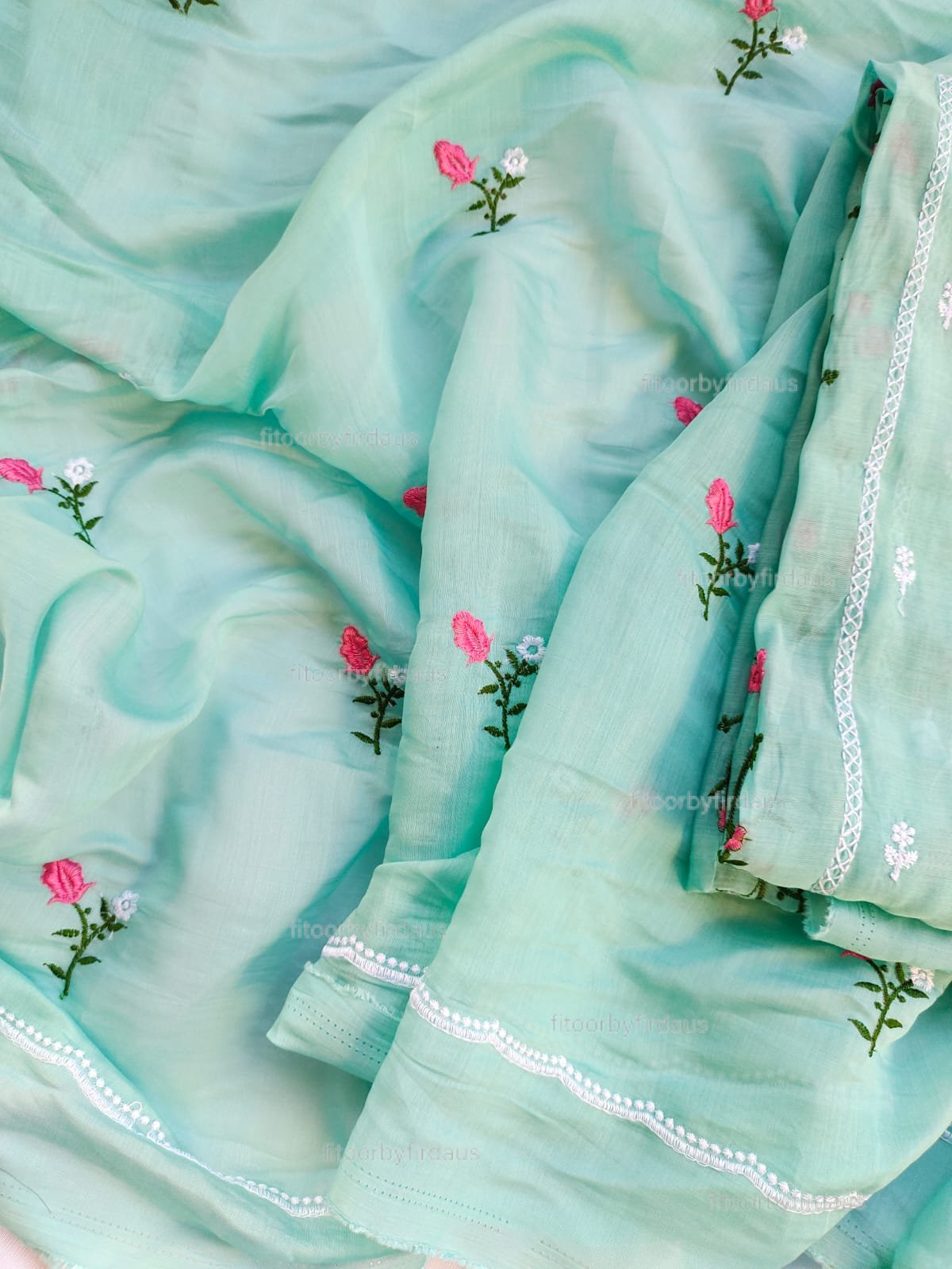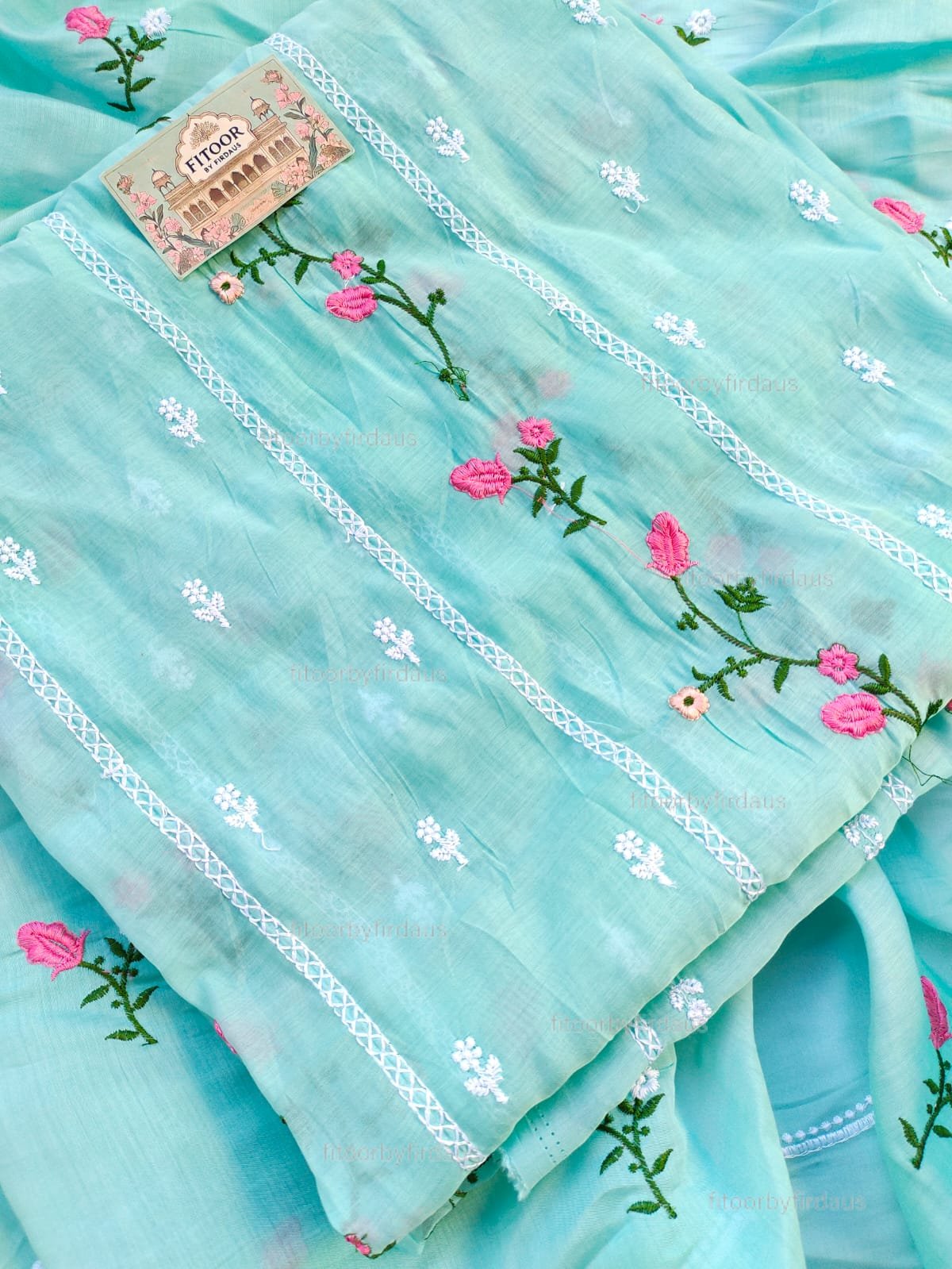 Light as a breeze and beautifully detailed, this Kota Doria suit features intricate machine embroidery on a sheer, breathable fabric. Perfect for effortless elegance in every season.